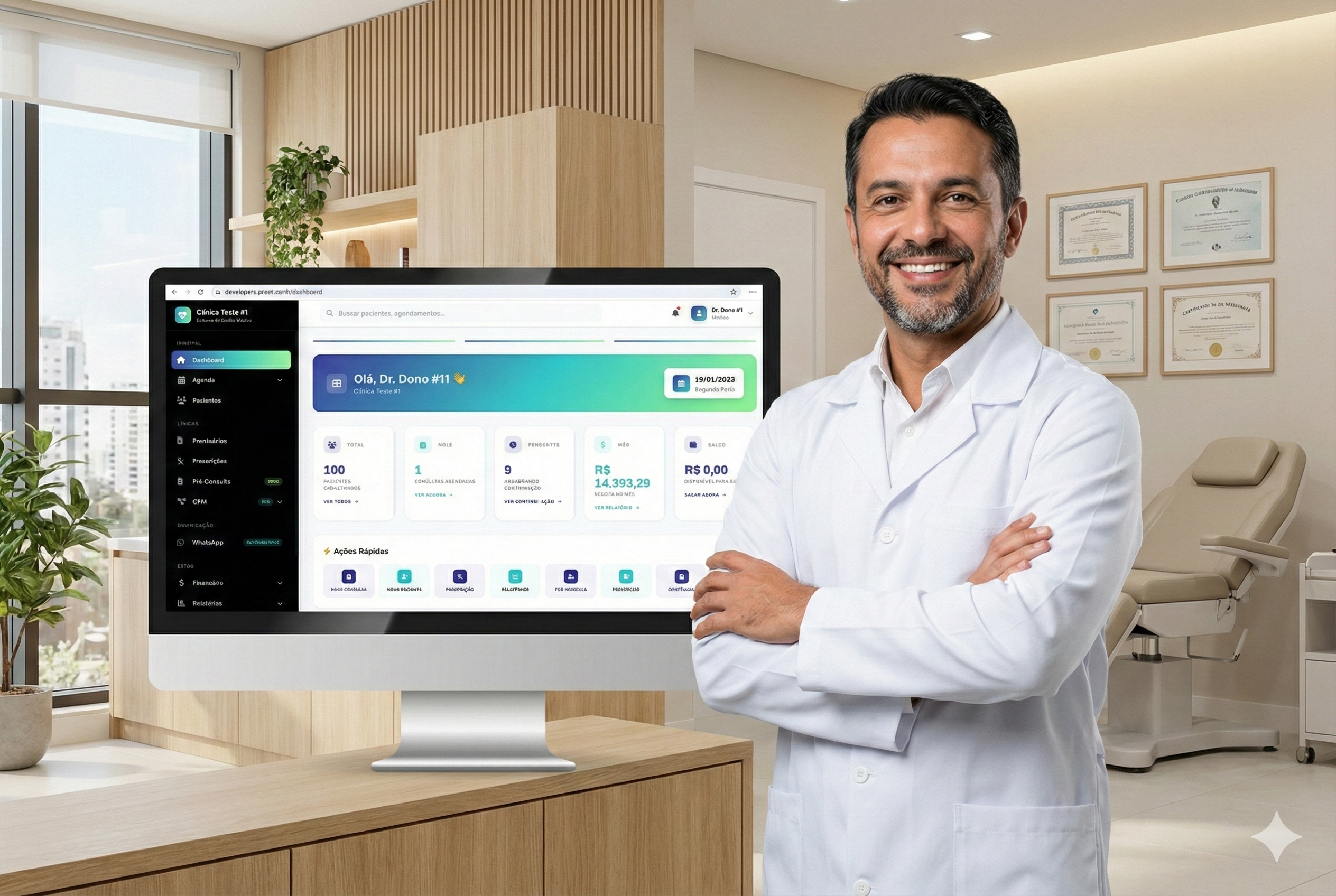 envie links de pagamento, faça prescrições digitais e muito mais — tudo de forma simples, rápida e segura.